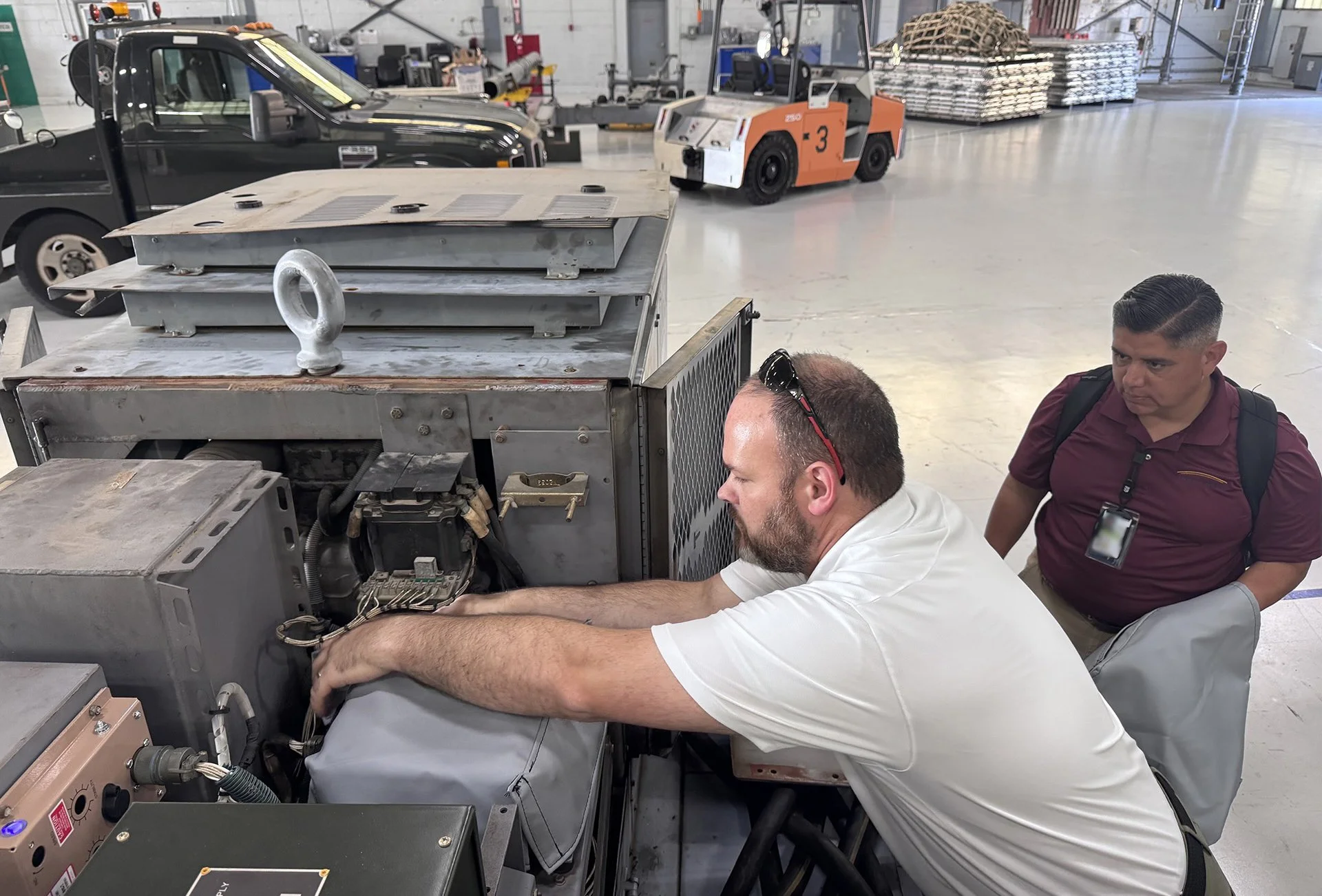 STRIKEWERX Innovation Lab Manager Aaron Finney and Transhield’s Jorge Martinez test the fitting of an internal cover for the B-52 Stratofortress power cart at Barksdale Air Force Base, Louisiana. The cover was designed from a previous STRIKEWERX design sprint to protect the power cart from water. (U.S. Air Force courtesy photo by Sean Green, STRIKEWERX) This photo was altered for security purposes by blurring out identification badges.